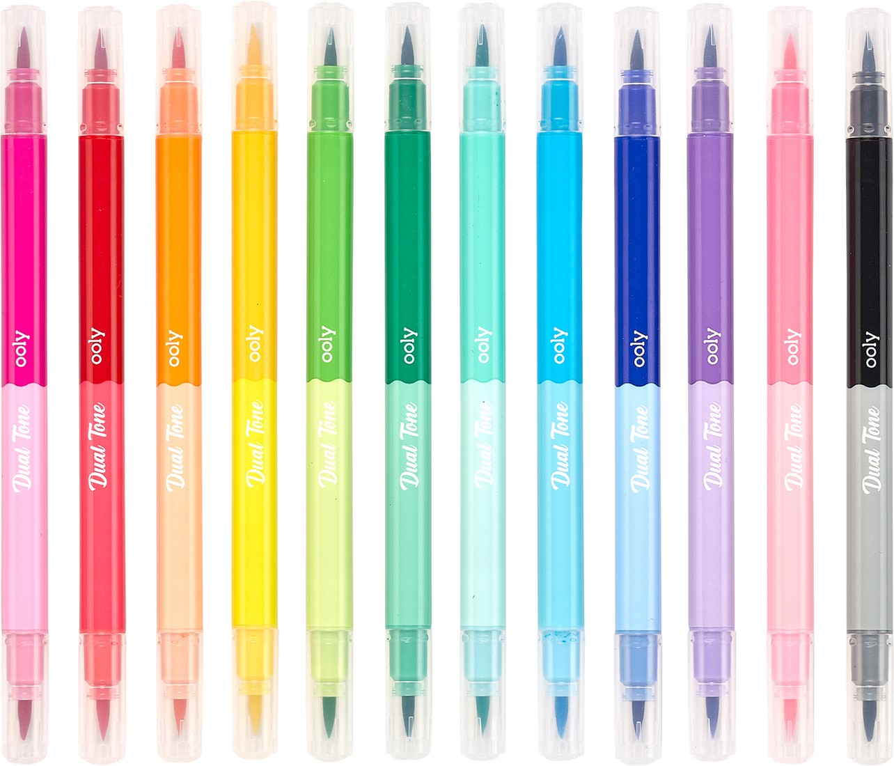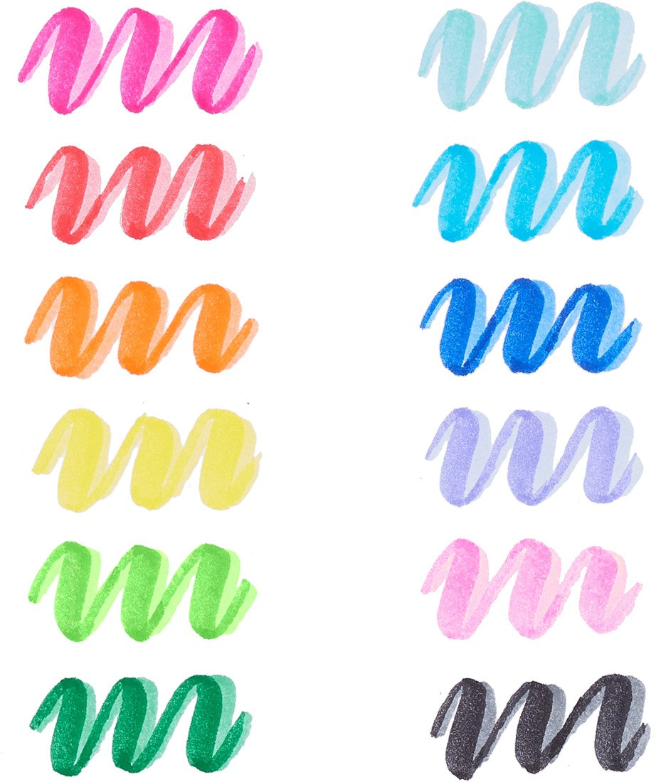Rotuladores de pincel de doble cara. 12 rotuladores con 24 colores diferentes. Rotuladores con punta de pincel. Tintas sin ácido. Aptos a partir de 6 años.