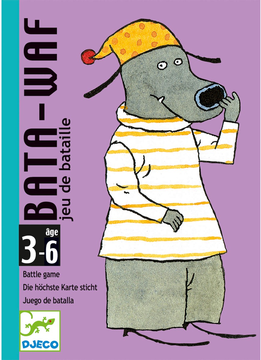 Cartas Bata-Waf DESCRIPCIÓN -Un adorable juego de batalla para los más pequeños con divertidas ilustraciones de perros. 1, 2, 3: los jugadores dan la vuelta a la vez a la primera carta de su mano: el perro más grande gana la baza. Si hay varios perros del mismo tamaño, ¡hay «Bata-Waf»! Cuando un jugador ha ganado todas las cartas, gana la partida. -Cartas graduadas de 1 a 6. Para los más pequeños, no hay necesidad de saber contar, ¡basta con comparar el tamaño de los perros! -Ilustraciones con perros divertidos que gustarán a los más pequeños. -Una caja compacta, que se puede llevar a todas partes. -Cartas de calidad y resistentes. Contenido: 36 cartas. Reglas del juego en 10 idiomas. Edad: A partir de 3 años Número de jugadores: De 2 a 4 jugadores Medidas producto: Medidas packaging: 8,5x11,7x2,8cm