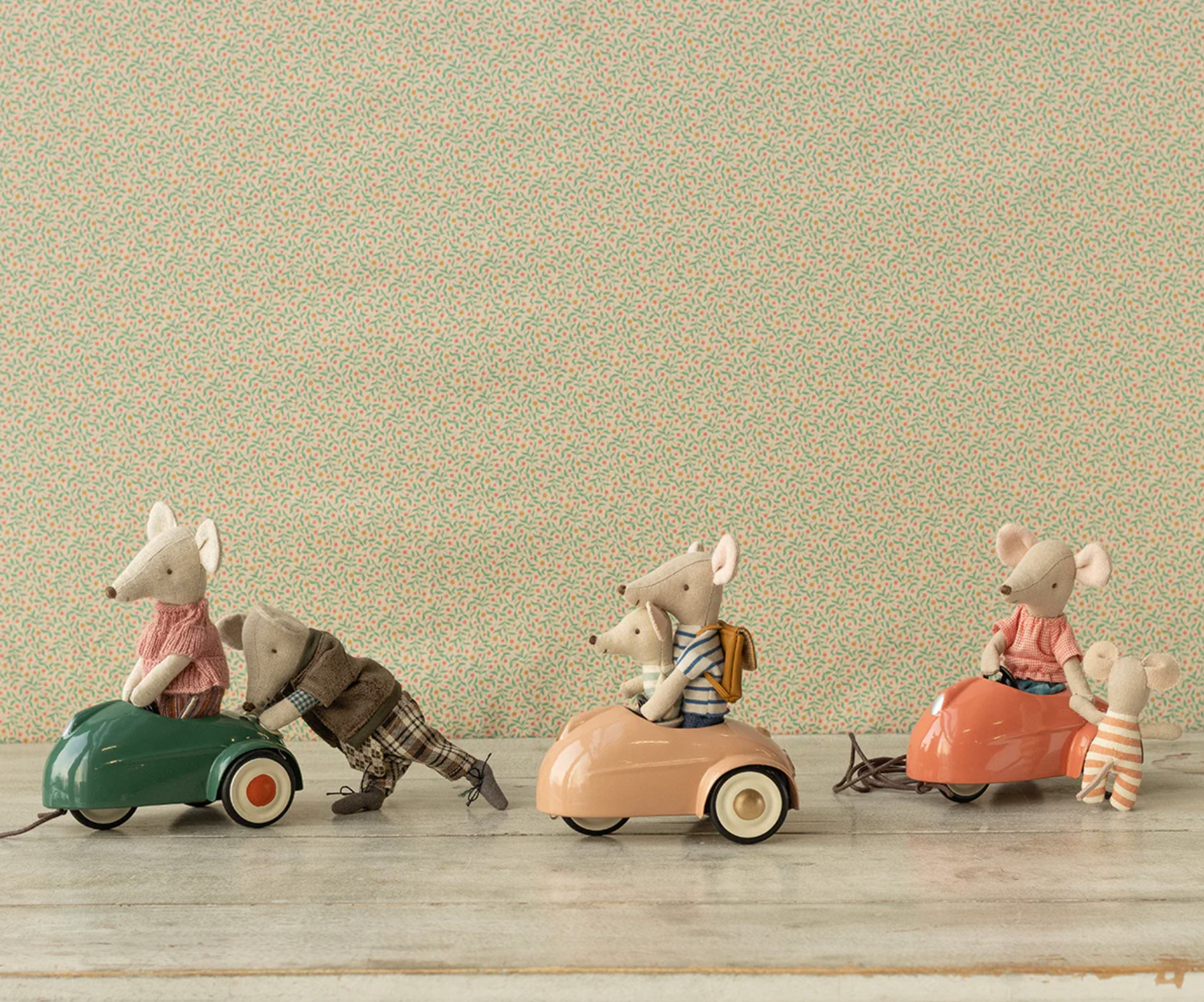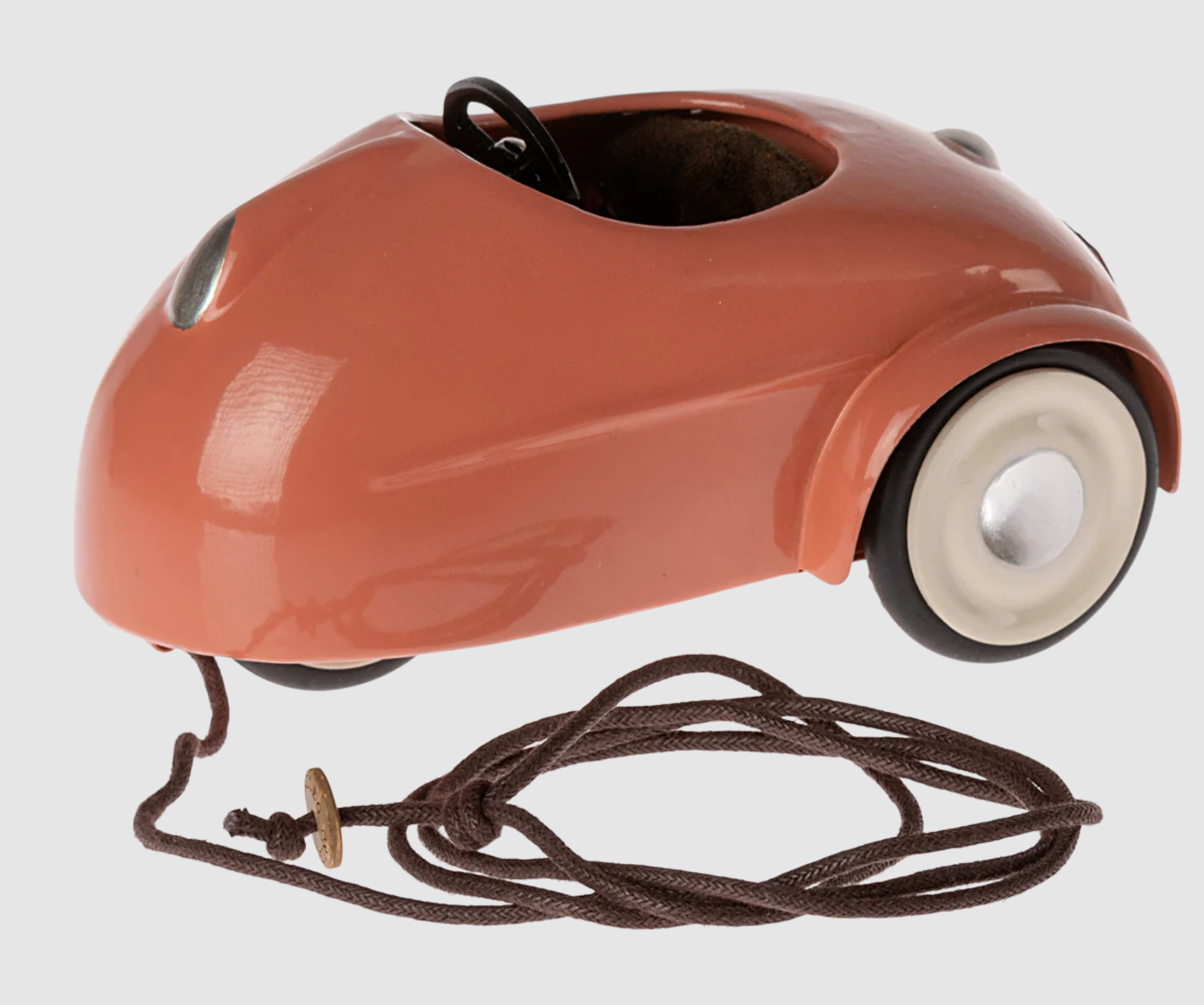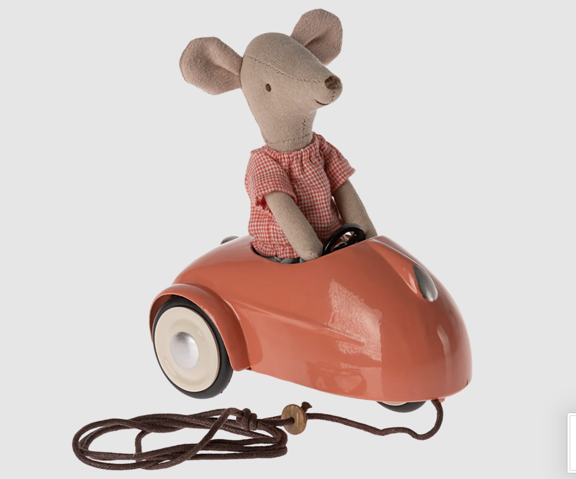 El coche metálico es el transporte perfecto para cualquier ratón. Encaja con todos los ratoncitos de la talla hermano/a menor y mayor y papá y mamá. Las cuerdas incluidas se pueden ajustar debajo del coche para que el niño tire del mismo