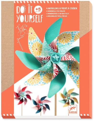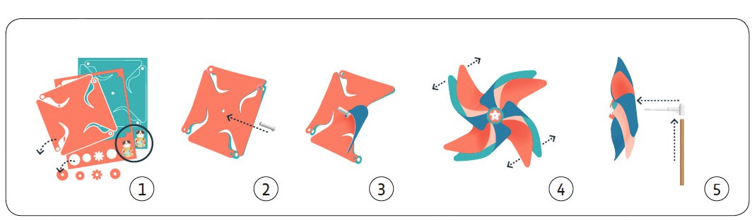 Sweet DESCRIPCIÓN -Un kit creativo para hacer 4 molinos de viento de colores suaves. Siguiendo las instrucciones, el niño monta, dobla y fija las hojas ilustradas en la varilla de madera para formar bonitos molinos de viento. Cuando sopla el aire, los molinos giran y los colores se mezclan para revelar nuevos motivos. -Hojas laminadas resistentes para un molino de viento decorativo más duradero. -El proceso paso a paso detallado en el manual guía al niño en su creación. -Marcas en las hojas para facilitar el montaje. -Un producto con el certificado FSC. Contenido: 8 planchas impresas precortadas, 4 varillas de madera, 4 puntas de plástico, 1 folleto explicativo. Edad: A partir de 5 años Número de jugadores: Medidas producto: 23x39cm Medidas packaging: 20x26x4,5cm