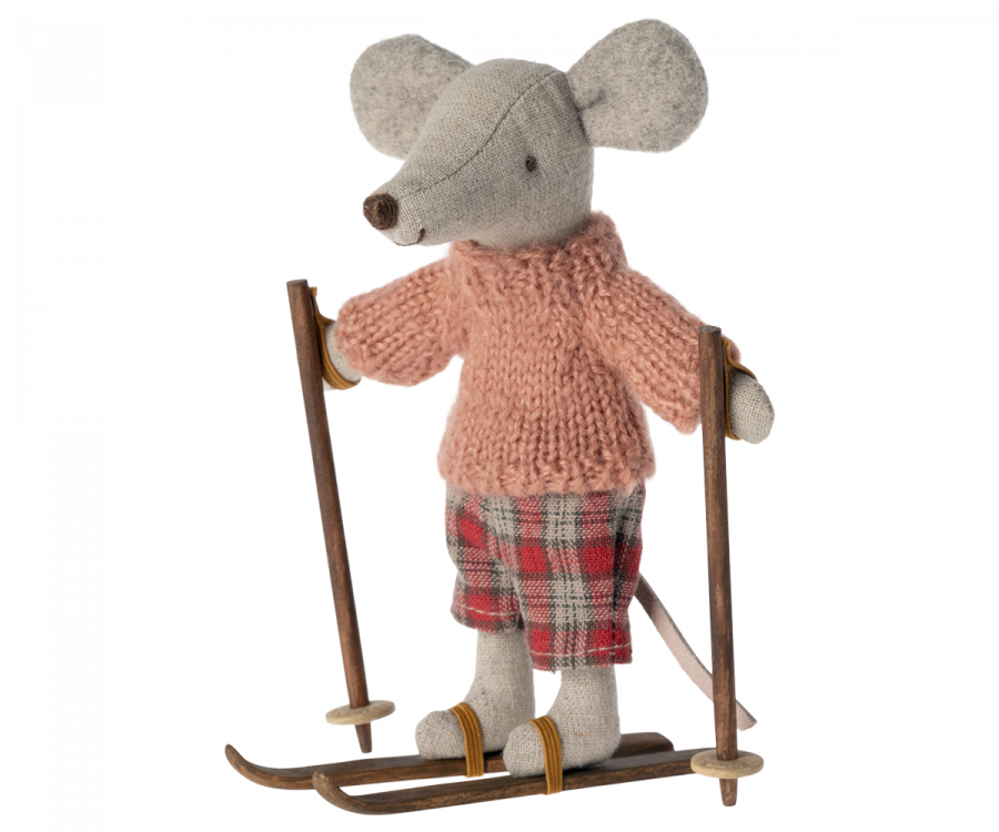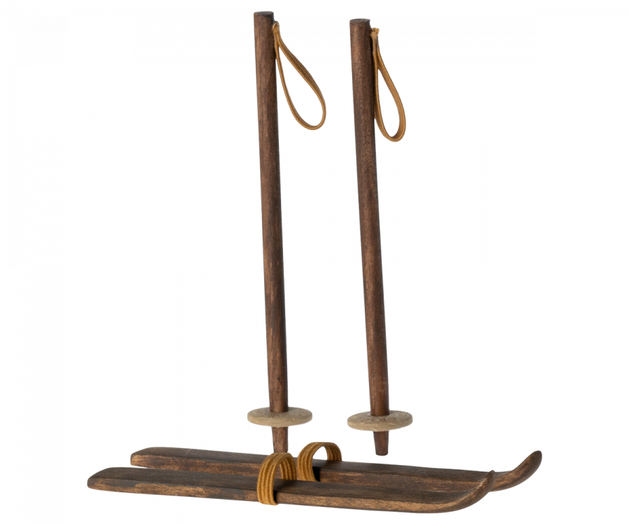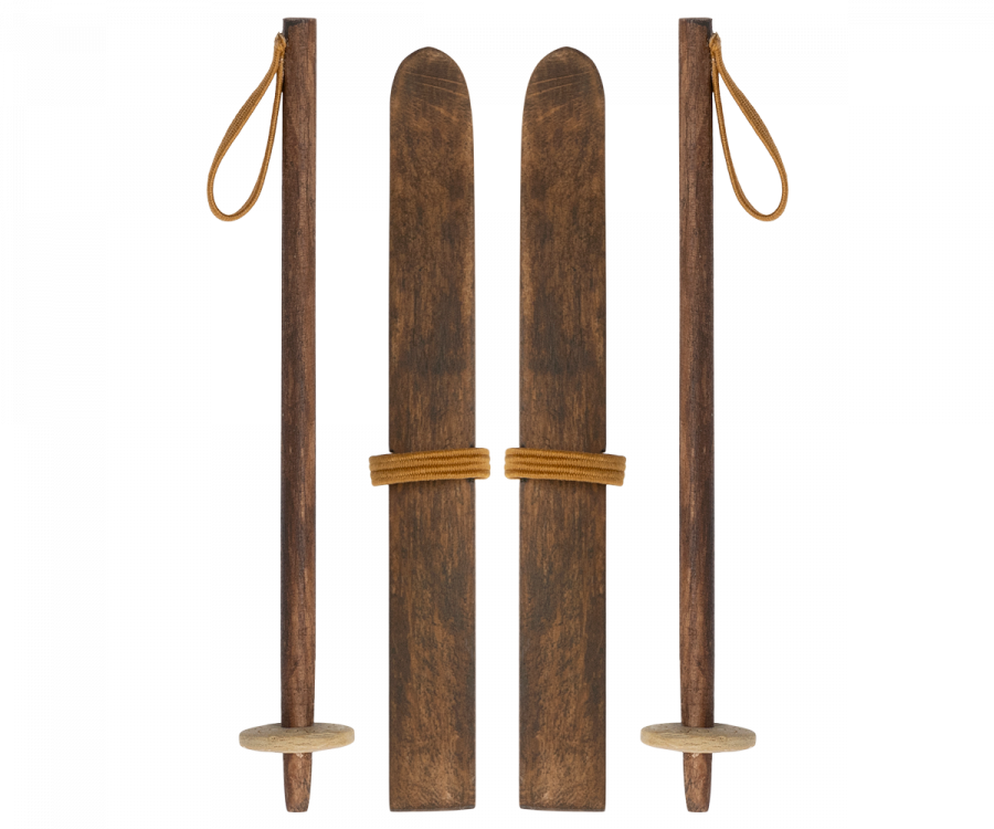 La actividad perfecta en invierno, jugar y esquiar en la nieve. Está hecho de madera y la banda elástica facilita la sujeción en las patas de los ratones. Se adapta a las tallas de hermano/a mayor de los Elfos.