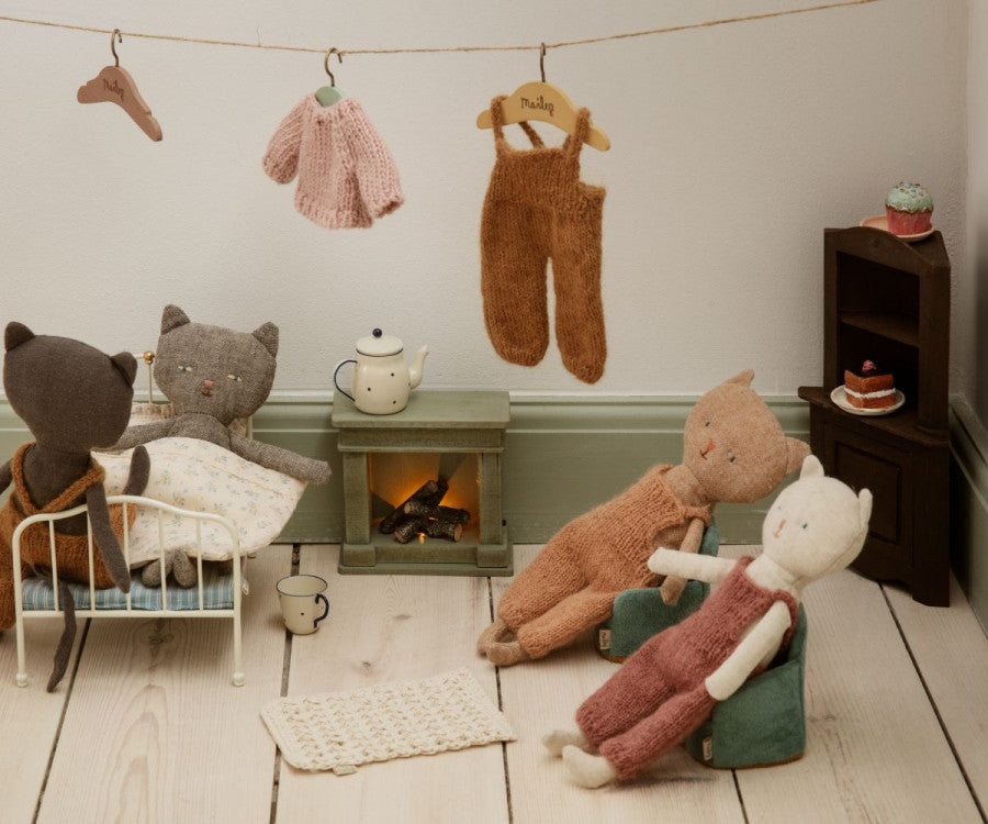 Este armario está hecho como un gabinete con forma de esquina y traerá algo nuevo a la sala de estar de la Casa en Miniatura de Maileg. Está pintado con aspecto vintage.