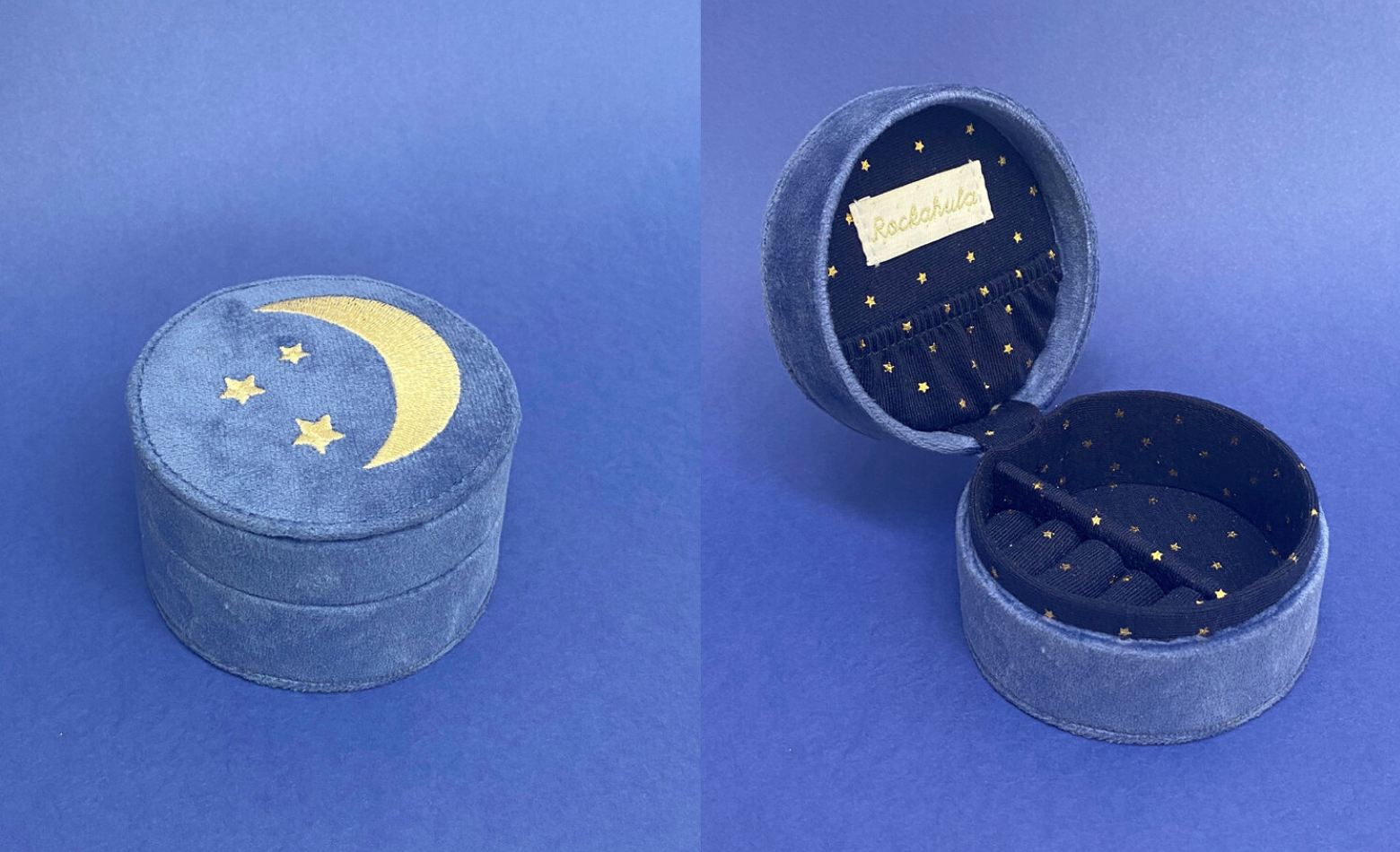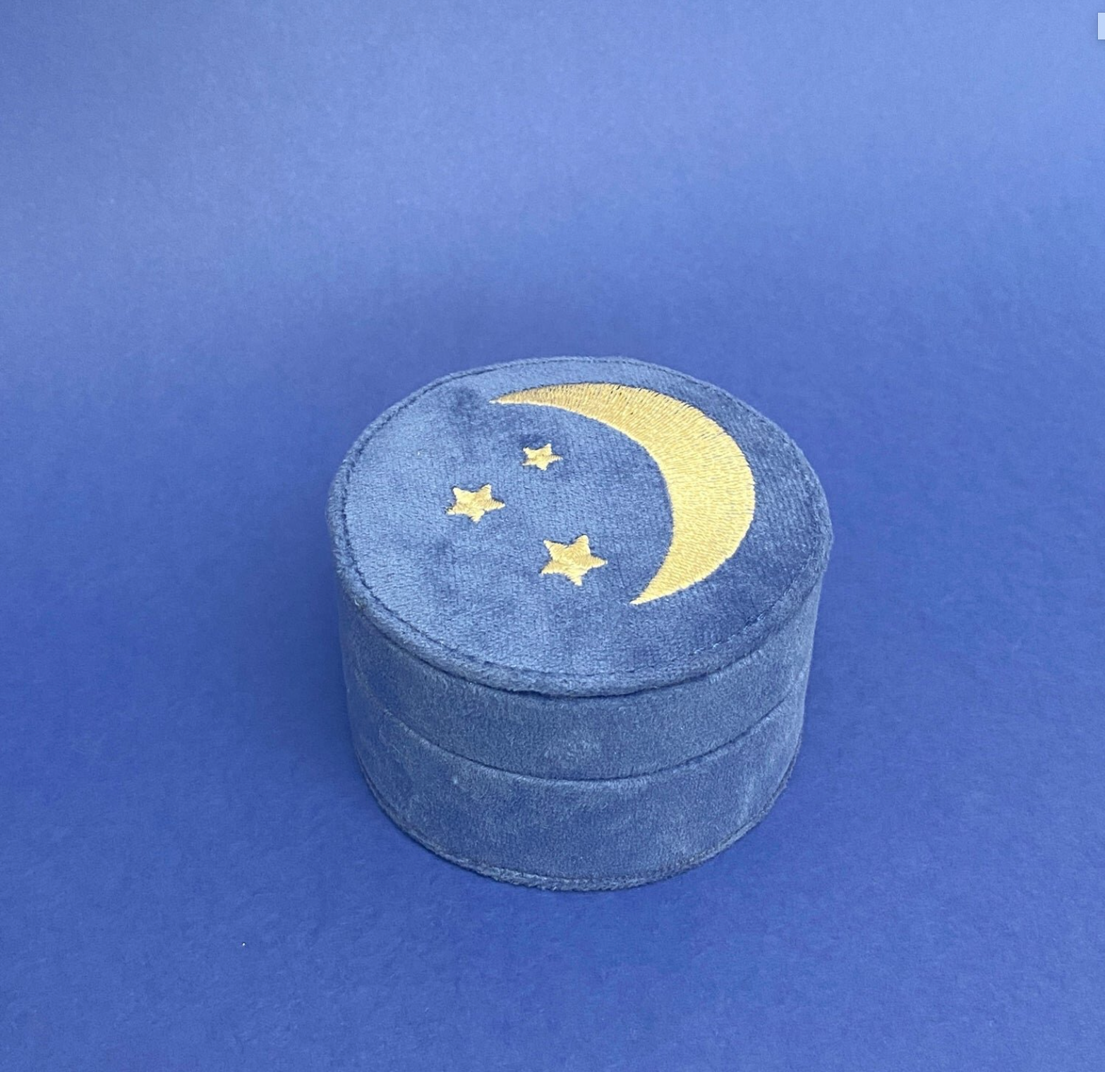 Con una hermosa luna y estrellas bordadas, este joyero se abre para revelar un compartimento, un bolsillo abierto y un espacio dedicado para colocar aretes y anillos. Totalmente forrado con el tejido de punto azul marino más hermoso con estrellas doradas dispersas.