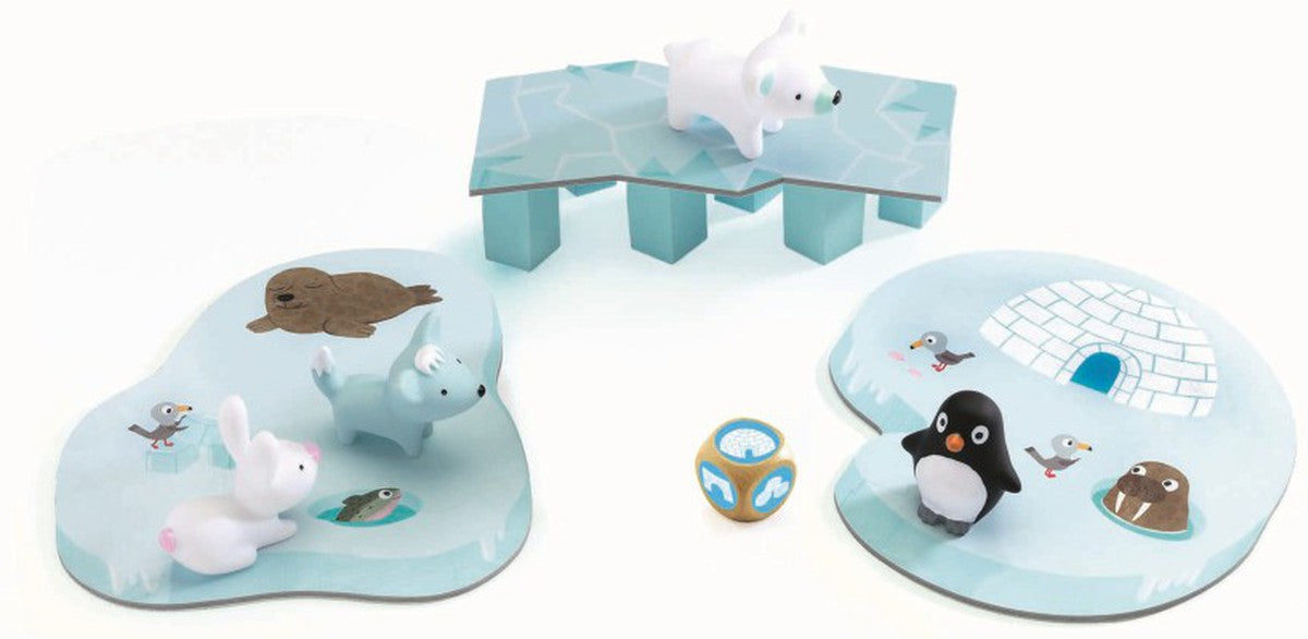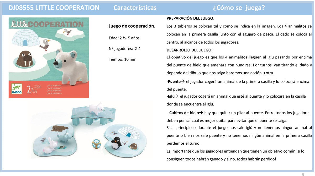 Juego Little Cooperation DESCRIPCIÓN -Un juego de cooperación concebido especialmente para los más pequeños, a partir de los 2 años y medio. En el témpano de hielo, los 4 animalitos están tratan de volver a su iglú. Para ganar, hay que ayudarlos a cruzar el puente de hielo antes de que se derrumbe, siguiendo las indicaciones del dado. ¡Cuando todos los animales estén a salvo, se gana la partida! -Un primer juego cooperativo para aprender a ganar o perder todos juntos. -Desarrolla el aprendizaje de la cooperación, el espíritu de equipo y la comunicación. -Bonitas figuras con forma de animales para trasladar a los niños a la historia del juego. -Material de calidad sólido y fácil de manejar con manos pequeñas: dados grandes, cartón grueso, figuras de plástico blando. -Reglas sencillas, fáciles de entender. -Un tiempo de juego breve, adaptado a la concentración de los más pequeños. -Momentos de intercambio y complicidad entre el adulto y el niño. Contenido: 2 tableros de «témpanos de hielo» (salida y llegada), 1 puente de cartón, 6 pilares de madera, 4 figuras de plástico blando (liebre de las nieves, oso polar, zorro de las nieves, pingüino), 1 dado de madera. Reglas del juego en 10 idiomas. Edad: A partir de 30 meses Número de jugadores: De 2 a 4 jugadores Medidas producto: Medidas packaging: 21,5x21,5x5cm