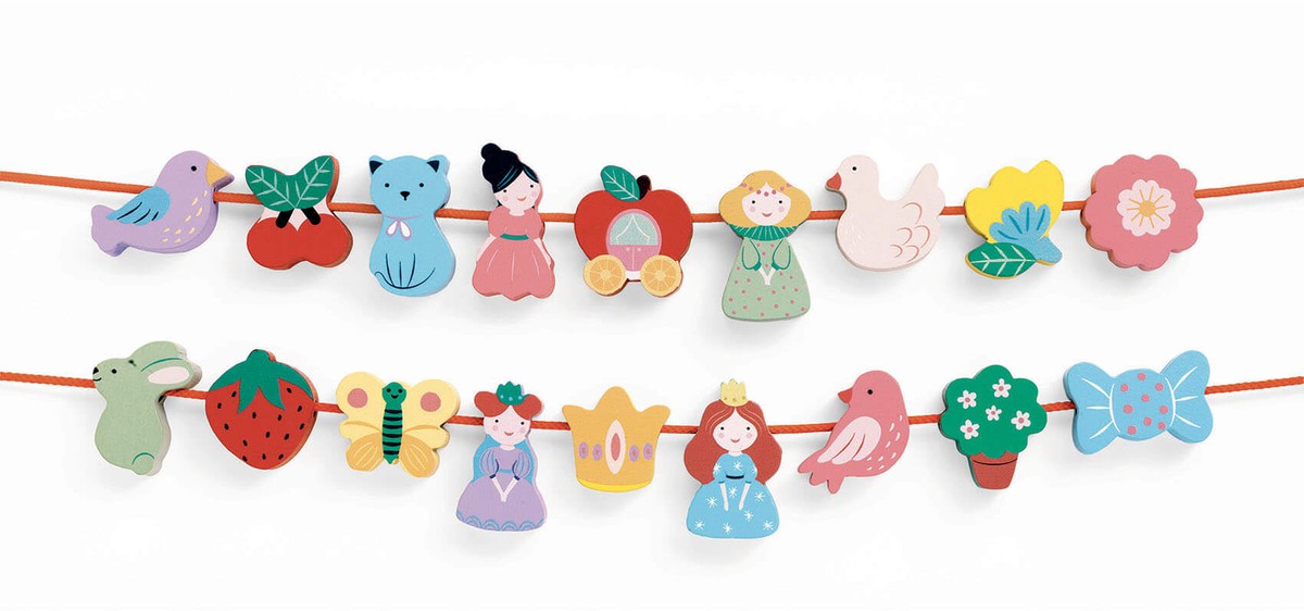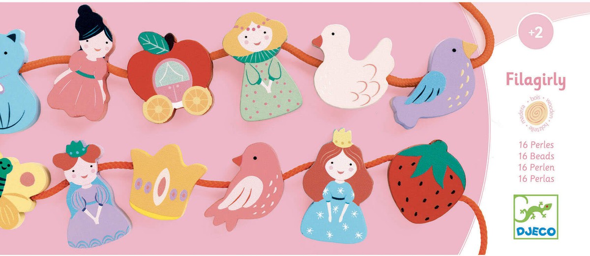 Perlas Filagirly DESCRIPCIÓN -Cuentas de madera con bellas ilustraciones sobre el tema de las princesas. El niño se divierte ensartando las cuentas en los 2 cordones, dando rienda suelta a su imaginación. Ideal a partir de los 2 años para las primeras experiencias de aprendizaje del niño. -Los extremos de los cordones son rígidos y largos para que resulte más sencillo ensartar las cuentas. -Cuentas gruesas y con siluetas que resultan fáciles de agarrar para las manos más pequeñas. Contenido: 16 cuentas de madera y 2 cordones de tela. Edad: A partir de 24 meses Número de jugadores: Medidas producto: Medidas packaging: 28x12x13cm