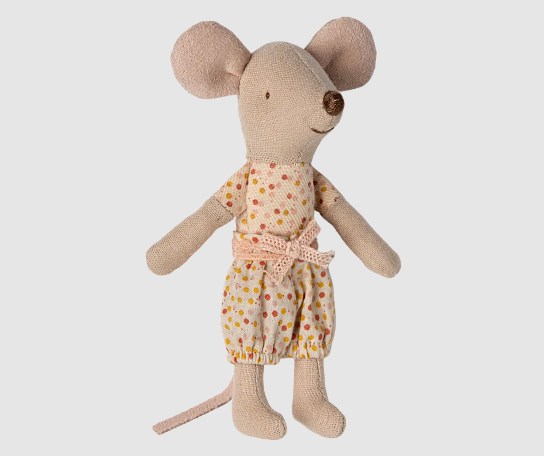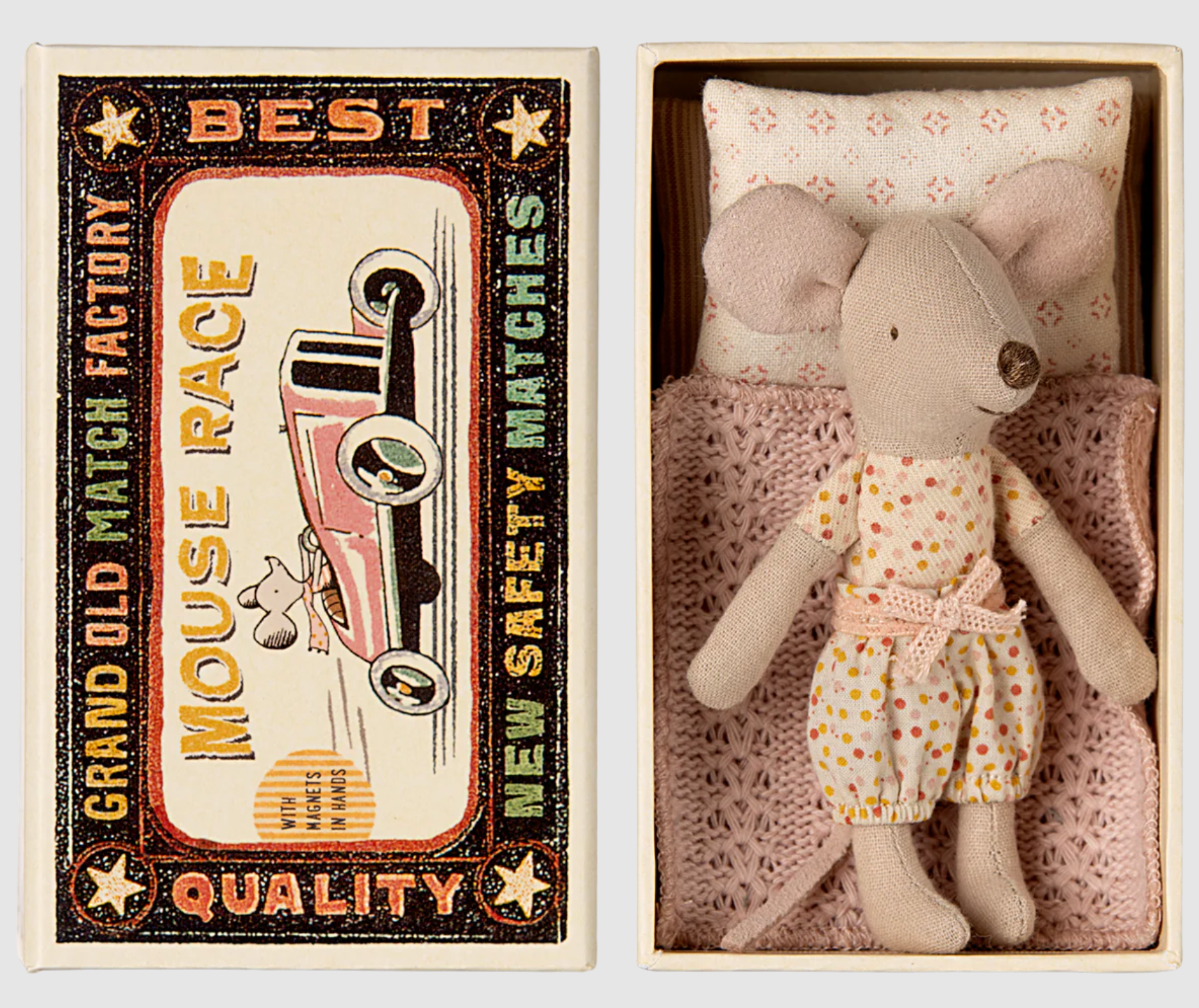Un artículo clásico de Maileg. Este ratón está listo para jugar durante horas y duerme en una pequeña caja de cerillas. La ropa y la ropa de cama están confeccionadas con tejidos suaves con estampados únicos en bonitos colores.