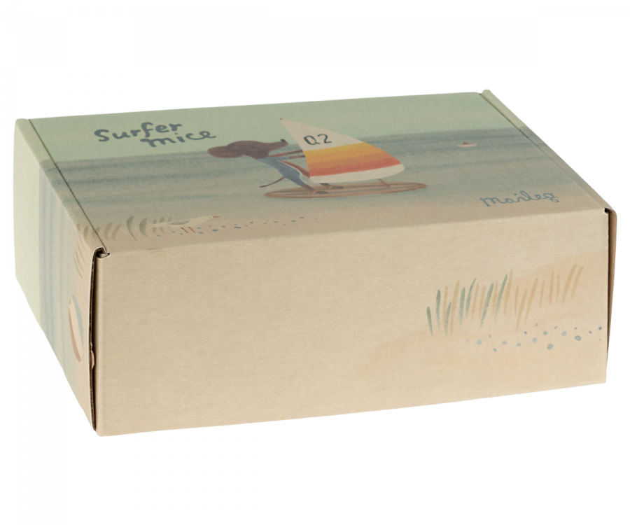 Este ratón está listo para un día de playa. Está vestido en traje de surfear y con su tabla para completar el aspecto de surfear. Lleva su gorra de parasol. El está listo para montar las olas. La tabla de surfear y el mástil son de madera.
